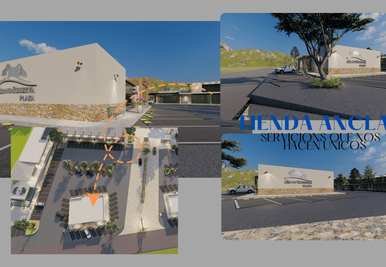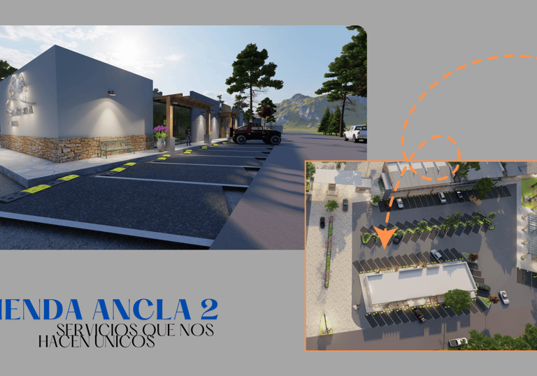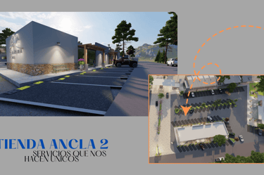La segunda tienda ancla presenta una estructura más diversificada, compuesta por un local principal de 200 M2 acompañado de dos locales adicionales de 50 M2 cada uno. Para satisfacer la demanda de tráfico, esta sección contará con 30 cajones de estacionamiento. El desarrollo de la Tienda Ancla 2 se realizará en un terreno con una superficie de 1,750 M2, permitiendo flexibilidad en la distribución de los locales y el flujo de clientes.